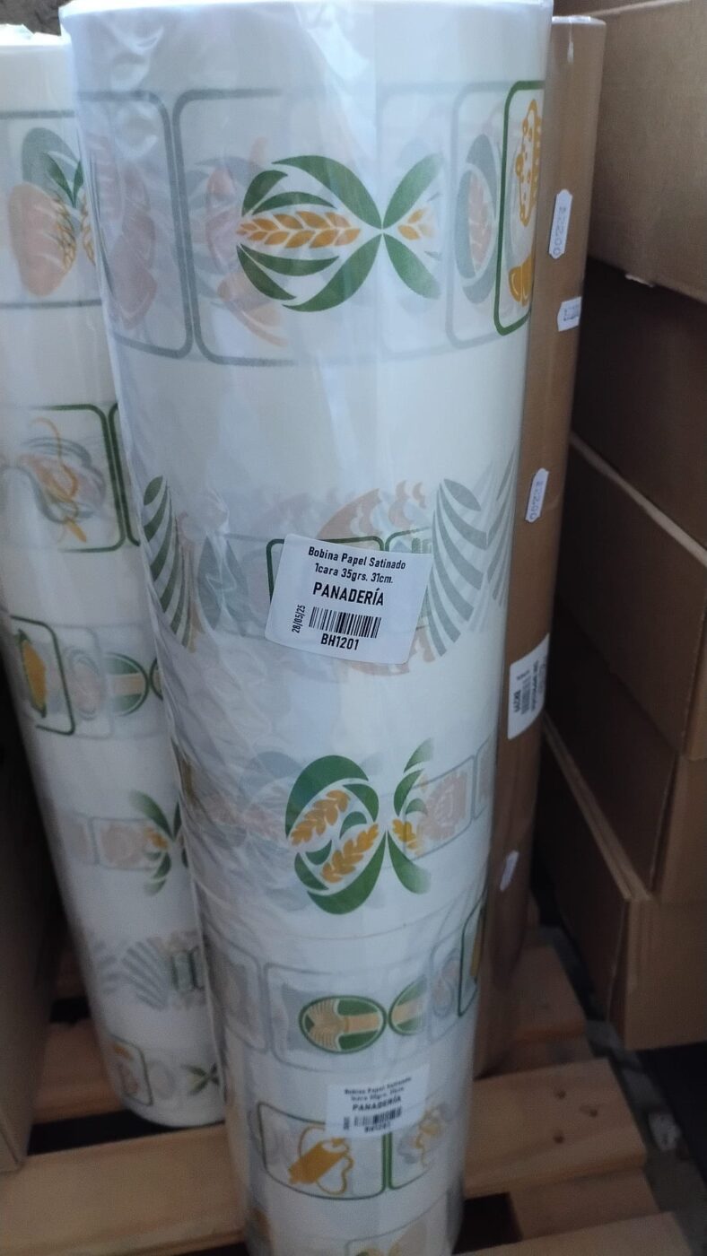 Bobina de papel de celulosa satinada de 35 gr en bobinas de 7kg de ancho 62 cm impresa generica panaderia. Tambien en ancho 31 cm