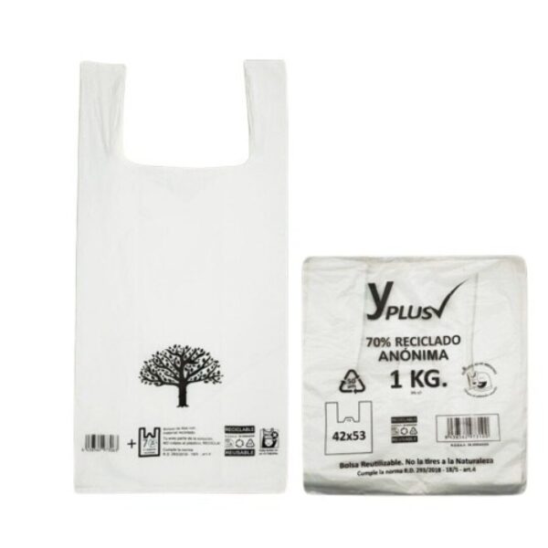 Bolsas de asa tipo camiseta de plastico PEHD RECICLADAS. Las bolsas blancas de asa camiseta fabricadas con plástico reciclado al 70% son una opción sostenible y respetuosa con el medio ambiente. Estas bolsas están hechas con plástico reciclado, lo que reduce la dependencia de materiales vírgenes y ayuda a prolongar la vida útil de los residuos plásticos. Cumplen con la normativa vigente. Galga 200 / 50 micras